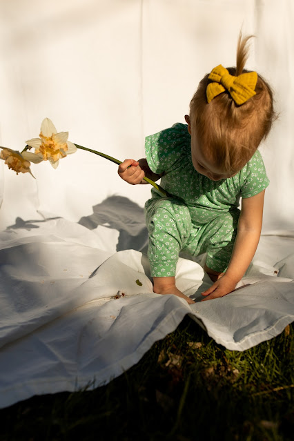 Lucy turned 2 this year! Unfortunately, she had a pretty bad fever on her birthday and was just not up for celebrating very much. :( We surprised her by blowing up a bunch of balloons for her to wake up to, and that was exciting, but she was just too tired and sick to fully enjoy them. (See: series of pictures of her not wanting her picture taken, starting to enjoy playing with the balloons, and then they won't stack in a tower the way she wants them to and she's upset again. haha) She also wasn't thrilled that I tried to take cute pictures of her in her new jumper in the backyard, even when I gave her two of my prized daffodils to play with!